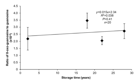 來(lái)自5’末端的轉(zhuǎn)錄本降解可以反映年齡相關(guān)的RNA氧化。最容易氧化的堿基,8-oxo-guanosine的豐度與總RNA中鳥(niǎo)苷豐度的比例與1989,1995,1999和2015年收獲的大豆種子胚軸的貯藏時(shí)間無(wú)關(guān)(圖5)。