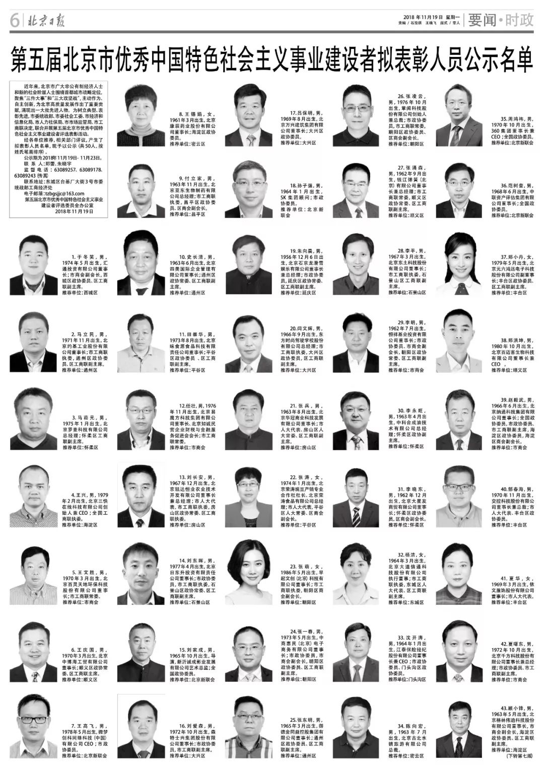 2018年11月19日,由市委統(tǒng)戰(zhàn)部、市委社會(huì)工委、市經(jīng)濟(jì)和信息化局、市人力社保局、市市場(chǎng)監(jiān)管局、市工商聯(lián)聯(lián)合評(píng)定的50位表彰人員在北京日?qǐng)?bào)公布。百邁客董事長(zhǎng)兼CEO鄭洪坤當(dāng)選第五屆北京市優(yōu)秀中國(guó)特色社會(huì)主義事業(yè)建設(shè)者。百邁客董事長(zhǎng)兼CEO鄭洪坤為北京市的經(jīng)濟(jì)發(fā)展,作出了重大貢獻(xiàn)。