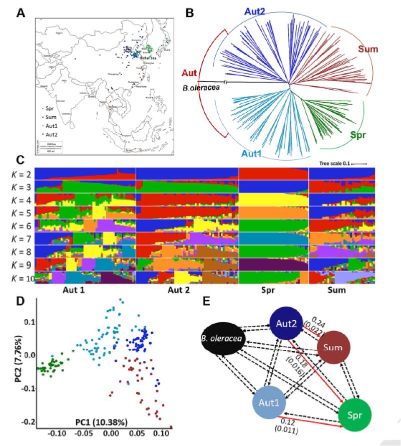 通過?K分析發(fā)現(xiàn)194個樣品分成4個代表種群是較好的模型,增加K值從2到10,等到的模型見上圖C,在K=2或3時,春大白菜能夠清晰的從其他群里分出來,在K=4時,秋大白菜被分為兩個群,定義為Aut1和Aut2,這個結(jié)果也被主成分分析支持(PCA),如上圖D所示。