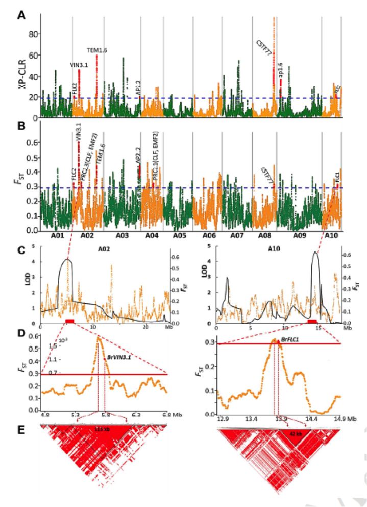 構(gòu)建了一個遺傳圖譜進行QTL定位以找到抽薹時間相關(guān)的區(qū)域,一共找到了7個QTLs,其中QTLs ftA02.1 and ftA10.1被發(fā)現(xiàn)在受選擇的兩個候選區(qū)域內(nèi)。通過多年對表型變化影響的反復檢測,推測它們參與了抽薹時間的調(diào)控。