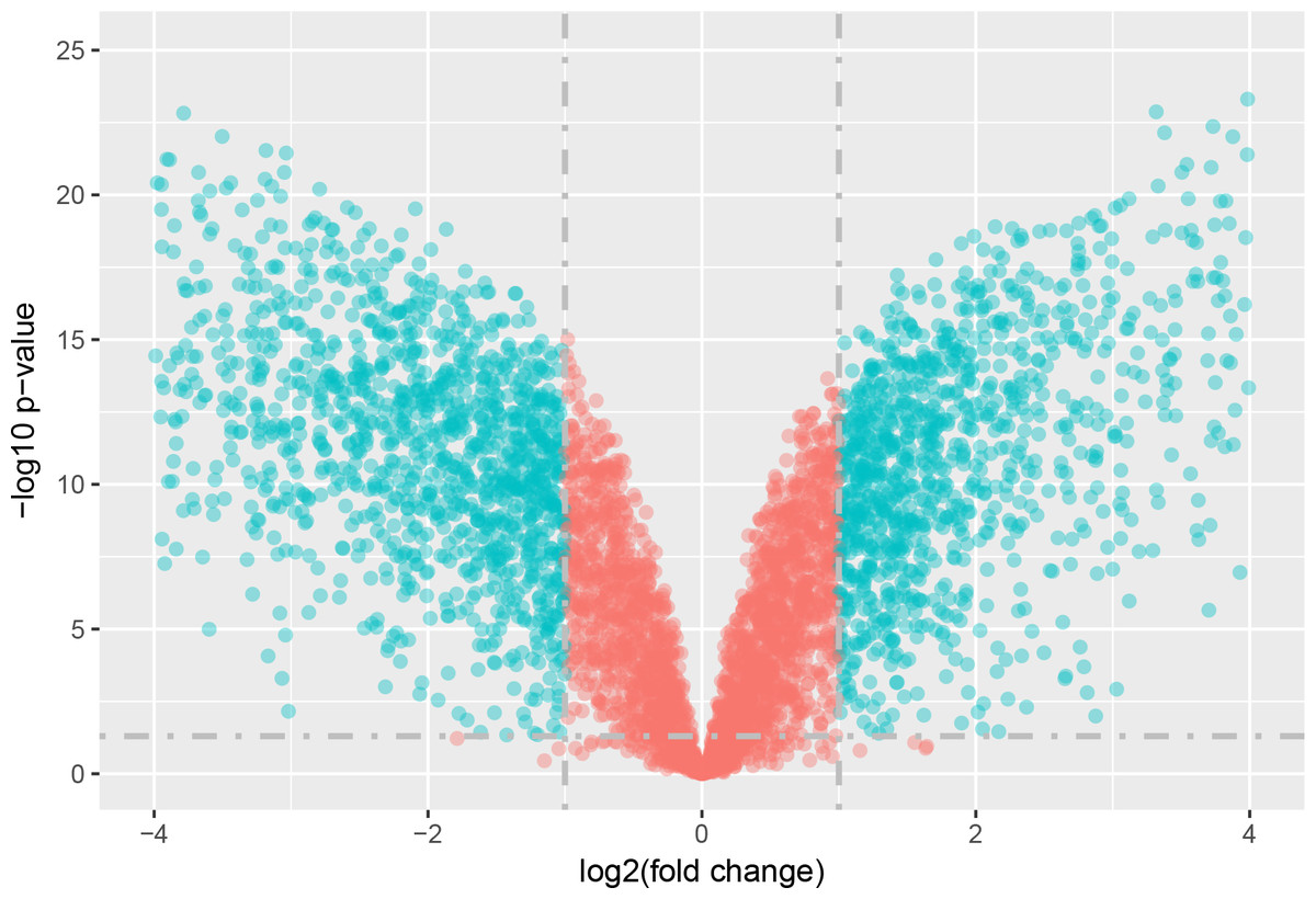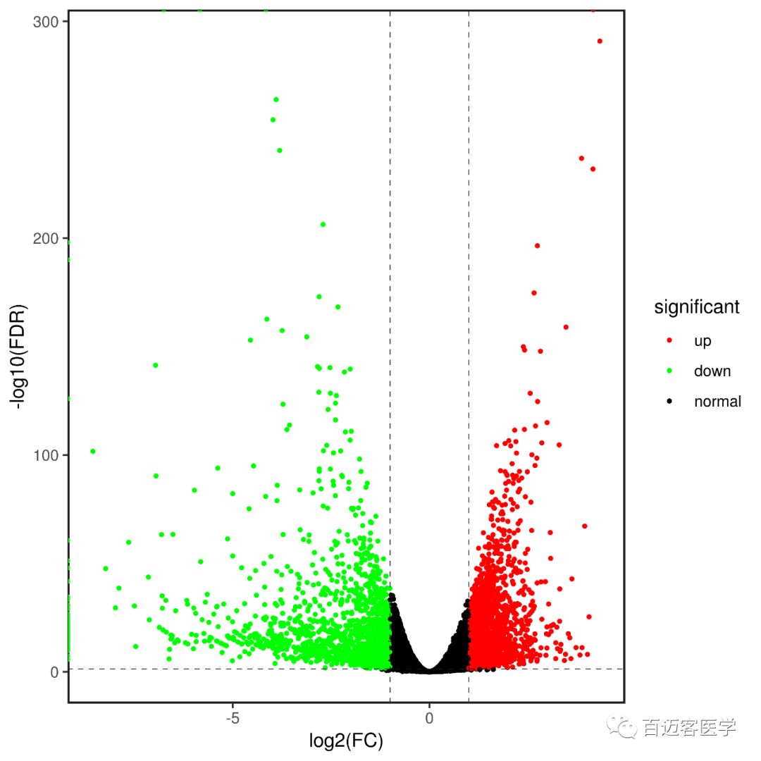 最后繪制出來的火山圖如下,是不是比干巴巴地在文章里面貼一個(gè)差異表達(dá)分析結(jié)果的表格好看多了?