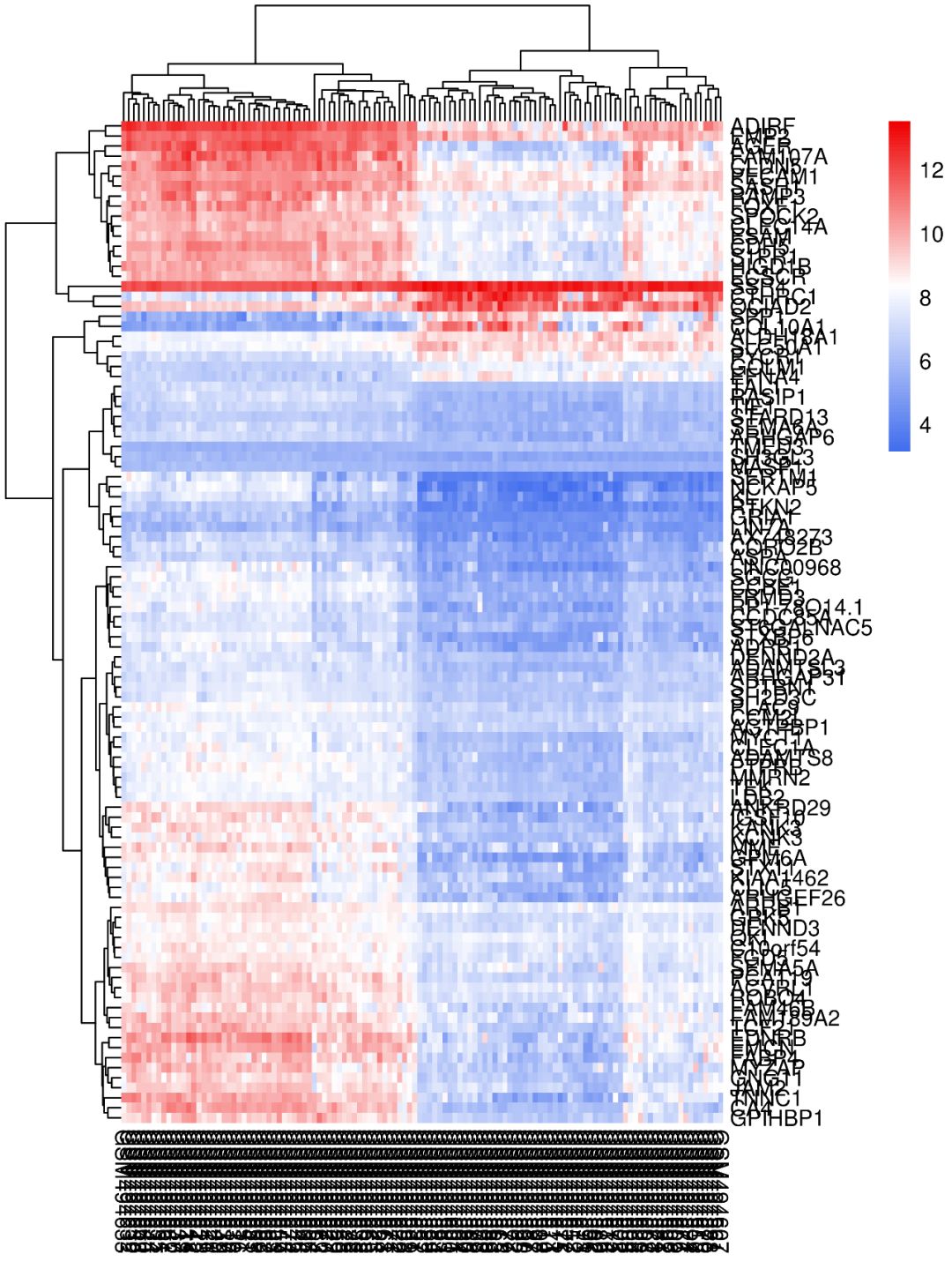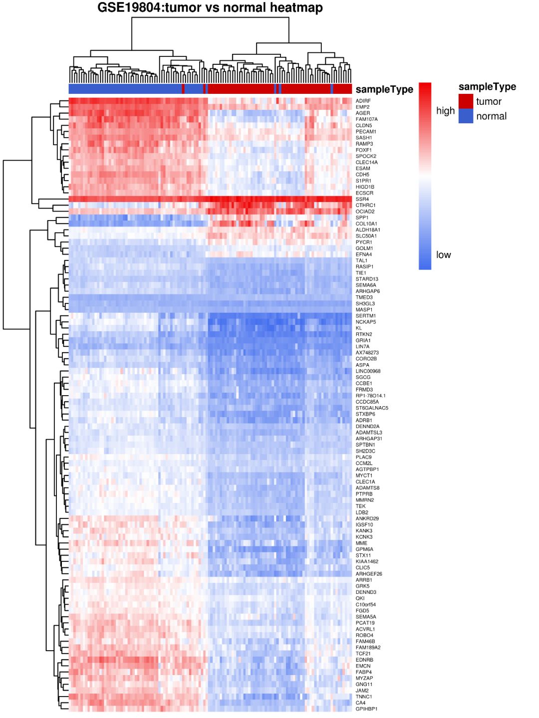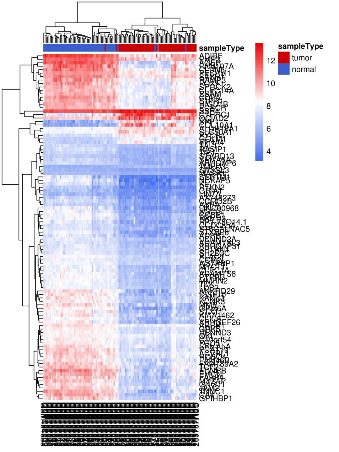 此次例子,我們選擇了一套GEO數(shù)據(jù)庫(kù)的肺癌數(shù)據(jù),數(shù)據(jù)編號(hào)為GSE19804,120個(gè)樣本,其中包含60個(gè)癌癥樣本和60個(gè)癌旁正常樣本,前面我們使用t檢驗(yàn),并對(duì)p值進(jìn)行BH校正,篩選fdr小于0.01的基因中前100個(gè)在癌癥相對(duì)于正常樣本中顯著差異表達(dá)的基因進(jìn)行熱圖繪制。