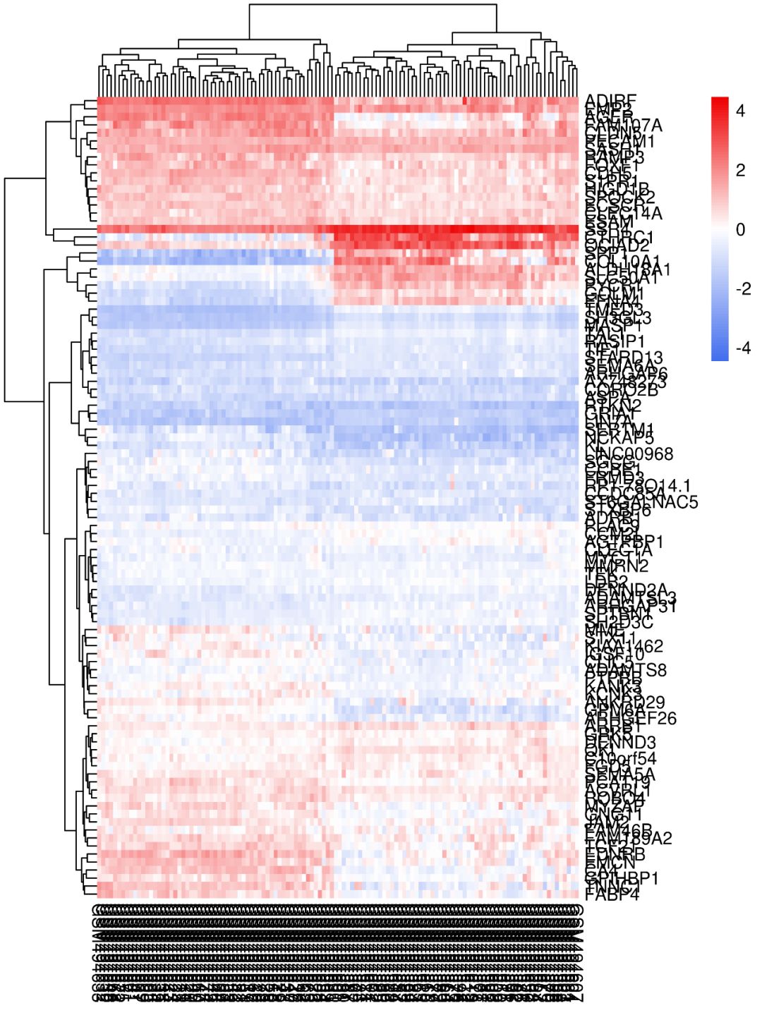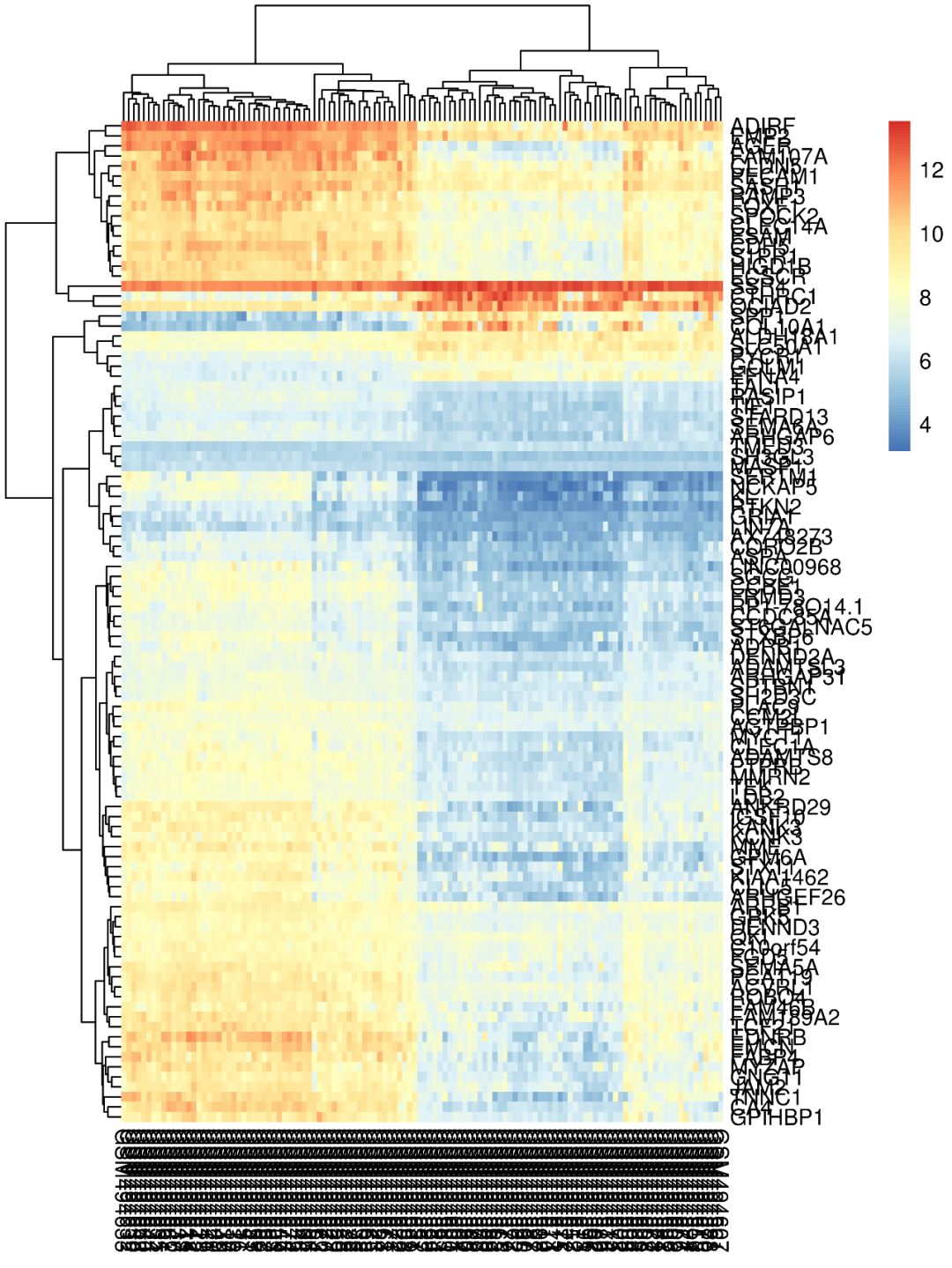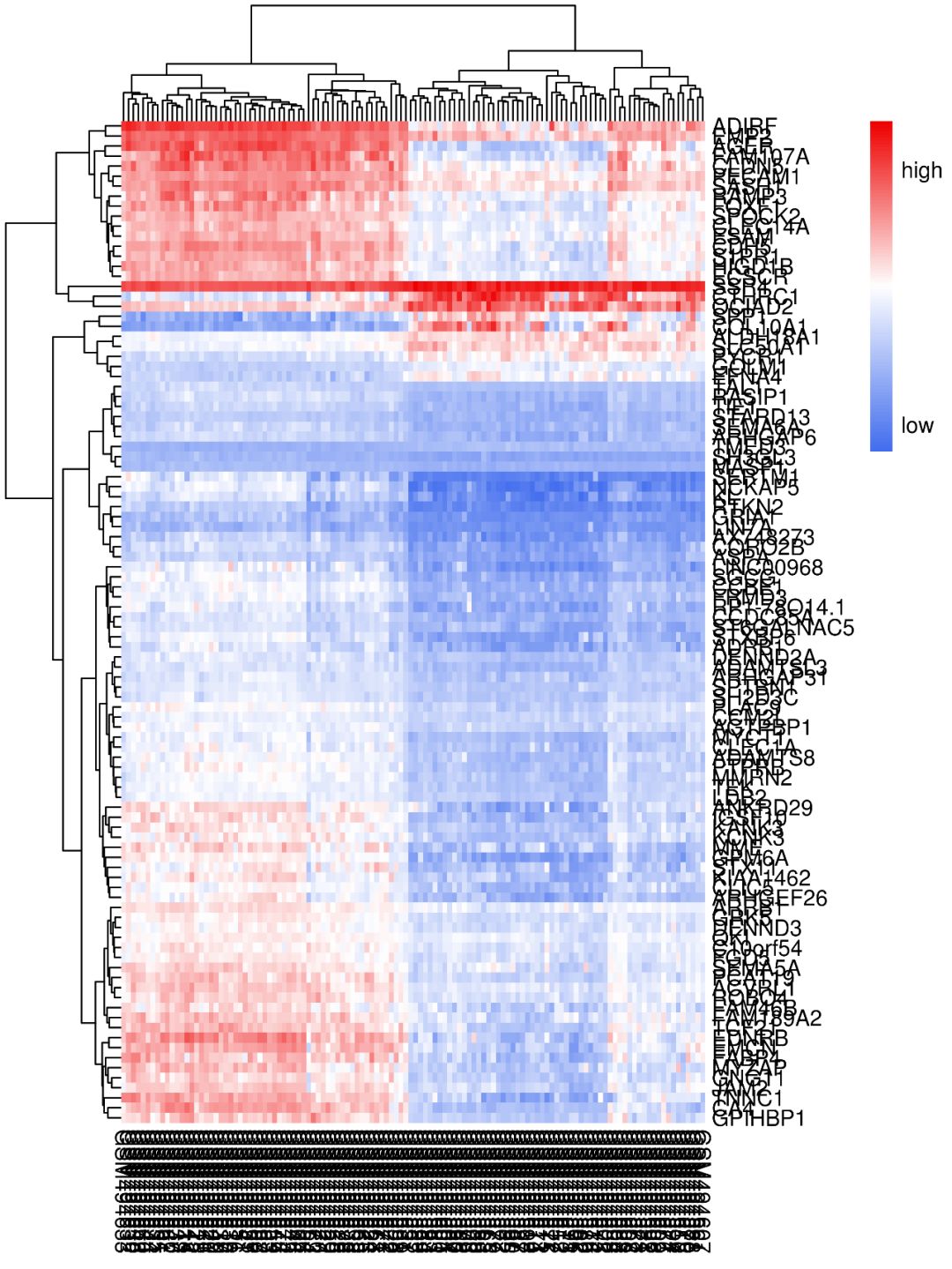 此次例子,我們選擇了一套GEO數(shù)據(jù)庫(kù)的肺癌數(shù)據(jù),數(shù)據(jù)編號(hào)為GSE19804,120個(gè)樣本,其中包含60個(gè)癌癥樣本和60個(gè)癌旁正常樣本,前面我們使用t檢驗(yàn),并對(duì)p值進(jìn)行BH校正,篩選fdr小于0.01的基因中前100個(gè)在癌癥相對(duì)于正常樣本中顯著差異表達(dá)的基因進(jìn)行熱圖繪制。
