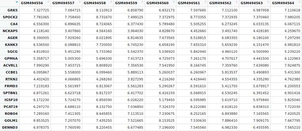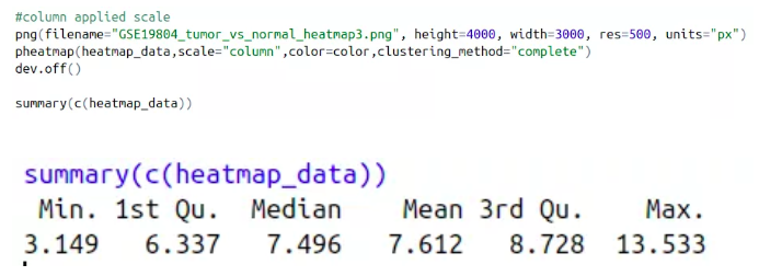 我們現(xiàn)在將數(shù)據(jù)進(jìn)行行均一化,聚類(lèi)方法選擇complete,進(jìn)行均一化之后的熱圖還沒(méi)有前面的好看,查看數(shù)據(jù)表達(dá)情況,我們發(fā)現(xiàn)最小的表達(dá)值3.149和最大的表達(dá)值13.533之間并沒(méi)有相差很大,因此這套數(shù)據(jù)其實(shí)不適合做均一化處理,畫(huà)出來(lái)的熱圖更好看。