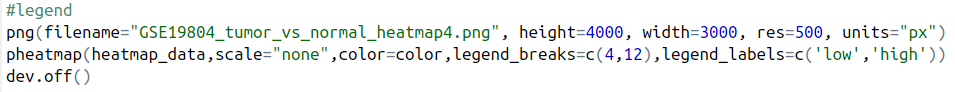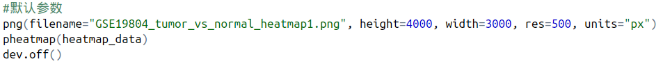 我們修改了字體大小,不顯示樣本名,以及設(shè)置圖片標(biāo)題,到此時(shí),經(jīng)過(guò)一系列參數(shù)更改,是不是已經(jīng)比一開(kāi)始使用默認(rèn)參數(shù)好看多了呢?(可以增加一個(gè)對(duì)比圖,GSE19804_tumor_vs_normal_heatmap6.png與GSE19804_tumor_vs_normal_heatmap1.png的 對(duì)比)。