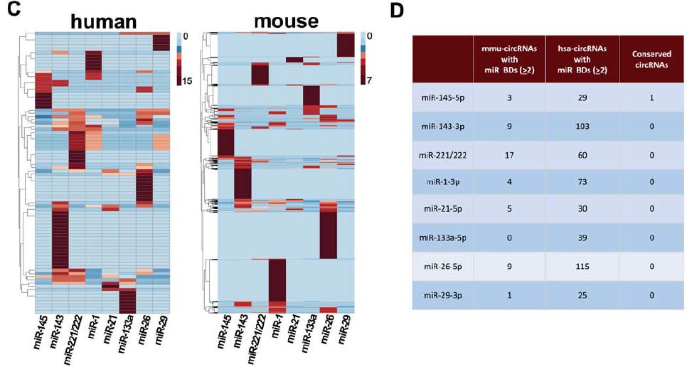 對于之前在VSMC具有重要生物學(xué)作用的miRNA,至少包含其中2個miRNA的保守結(jié)合位點:只有一個circRNA具有miR-145-5p結(jié)合位點,在小鼠和人之間是保守的。(小鼠中已被命名為circ_1529,人類中命名為circ_8932,其來源基因為Lrp6,其至少具有7個miR-145-5p結(jié)合位點)