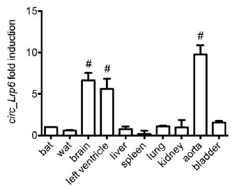 divergent primer擴(kuò)增cDNA和gDNA,驗證其來源于可變剪接;RNAse R抗性檢測;放線菌素D處理抑制轉(zhuǎn)錄證實circRNA的穩(wěn)定性(更長的turn-over時間);qRT-PCR檢測各組織中circ_Lrp6表達(dá)水平并結(jié)合RNA-seq數(shù)據(jù)進(jìn)行分析:circ_Lrp6和Lrp6在血管中富集。