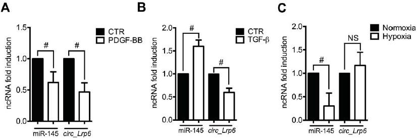 血小板衍生生長因子(PDGF-BB)和轉(zhuǎn)化生長因子(TGF-β)分別處理VSMC,在TGF-β處理的細(xì)胞中circ_Lrp6和miR-145表達(dá)之間存在負(fù)相關(guān)。