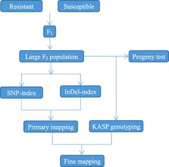 ? ? ? 本研究采取一種新的組合策略(圖1.),即兩步信息分析SNP-index與InDel-index共定位,結(jié)合KASP標(biāo)記分型精細(xì)定位,快速定位到特定性狀候選基因,為克隆Cf-10基因以及分子標(biāo)記輔助育種提供一條強(qiáng)力有效的途徑。