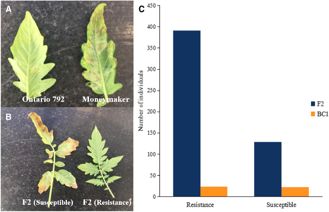 為考察Cf-10的遺傳基礎(chǔ),作者對(duì)品種Ontario 792,Moneymaker及其F1,F(xiàn)2與BC1F1群體的抗病能力進(jìn)行評(píng)估。結(jié)果顯示,品種Moneymaker對(duì)10種病菌生理小種表現(xiàn)敏感,而Ontario792均表現(xiàn)顯著抗病能力,暗示Ontario792對(duì)番茄葉霉病菌具有廣譜抗病能力;所有F1代個(gè)體均表現(xiàn)抗病,F(xiàn)2代抗病與感病個(gè)體呈現(xiàn)3:1分離比,暗示Cf-10受顯性單基因控制,并且BC1F1的表型分離比驗(yàn)證了這一結(jié)果(圖2.)。