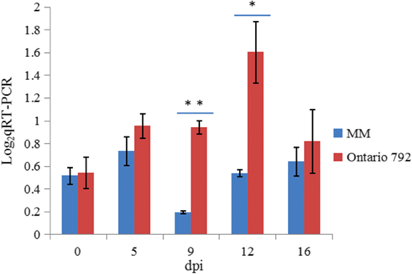 圖5. RT-qPCR分析候選基因Solyc01g007130.3的表達(dá)量(病菌侵染后)