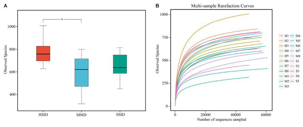 組間和組內(nèi)β距離在箱型圖中顯示(圖4),結(jié)果表明HMD和MMD組(圖4A)之間以及HMD和SMD組之間細(xì)菌群落的極顯著差異(圖4B)(?P <0.01)。