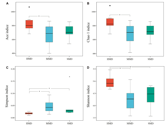 麝鹿糞便樣本中Alpha多樣性指數(shù)(Ace,Chao 1,Simpson和Shannon)(圖2)和健康和腹瀉的樣本β多樣性指數(shù)統(tǒng)計(jì)結(jié)果顯示:HMD和MMD之間的Ace、Chao 1、Simpson和Shannon指數(shù)存在顯著差異(P <0.05)。MMD和SMD之間沒(méi)有顯著性差異。HMD和SMD的比較發(fā)現(xiàn)有顯著性差異(P <0.05)。