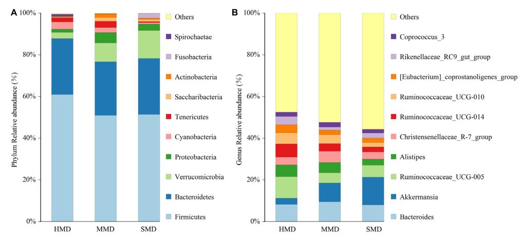 1、試驗(yàn)材料:選擇了4-6歲的成年森林麝鹿,包括8只健康麝(HMD)(編號(hào)H1-H8),8只輕度腹瀉麝(MMD)(編號(hào)M1-M8),和5只嚴(yán)重腹瀉的麝(SMD)(編號(hào)S1-S5)。共收集了21份糞便樣本。2、試驗(yàn)方法:Illumina HiSeq 2500?,16SV3+V4