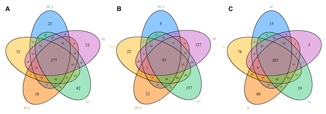 物種分類(lèi)柱狀圖是表示HMD、MMD和SMD樣本中物種的組成及對(duì)應(yīng)物種在該樣本中的相對(duì)豐度。HMD、MMD和SMD樣本中在門(mén)水平和屬水平相對(duì)豐度前10的物種如圖5所示。無(wú)論是否存在腹瀉的樣本中,厚壁菌和擬桿菌都是主要的優(yōu)勢(shì)菌。然而,健康森林麝的糞便中厚壁菌的相對(duì)豐度明顯高于腹瀉麝。厚壁菌是構(gòu)成食物中纖維素分解代謝并將纖維素降解為宿主揮發(fā)性脂肪酸的主要細(xì)菌類(lèi)型。此外,厚壁菌門(mén)還可以調(diào)節(jié)體內(nèi)免疫反應(yīng),抑制病原體的侵襲和預(yù)防腸道炎癥。腹瀉麝腸道中厚壁細(xì)胞豐度的減少可能會(huì)同時(shí)降低該物種的消化生理功能。另外,β多樣性的比較顯示,健康和腹瀉森林麝的細(xì)菌群落差異極顯著,這與麝的異常消化生理功能有關(guān)。HMD、MMD和SMD三組不同樣本之間共有OTU和特有OTU數(shù)量如圖6所示。