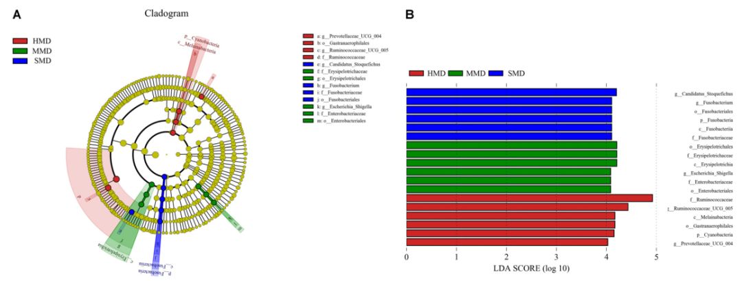 LefSe分析表明(圖7),在屬的水平上,MMD組與HMD和SMD組之間顯著性差異較大的菌種為埃希氏菌?–?志賀氏菌。埃希氏菌屬?–?志賀氏菌是常見(jiàn)的病原體,其主要的傳播途徑包括:受感染對(duì)象的糞便、食物和含有細(xì)菌的水。該病原體可引起結(jié)腸粘膜炎癥,導(dǎo)致腹痛、腹瀉和形成粘膜糞便等癥狀。因此,用于喂養(yǎng)麝的食物和水以及糞便管理是減輕輕度腹瀉的關(guān)鍵。另外,SMD組與HMD和MMD組之間顯著性差異較大的菌種為梭桿菌。梭桿菌是炎癥性微生物,它可抑制體內(nèi)T細(xì)胞應(yīng)答并促進(jìn)炎性因子的表達(dá)。比較MMD組和SMD組,可以推測(cè)Fusobacterium可能在輕度腹瀉的背景下增殖并成為主要病原體。因此,森林麝的腸道生理紊亂與其主要病原體的類(lèi)型是存在一定的相關(guān)性的。