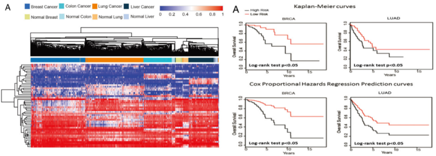 從TCGA中常見癌癥(肺癌、乳腺癌、結(jié)腸癌、肝癌)的甲基化數(shù)據(jù)中篩選癌癥標記物,這些標記物能非常準確的(準確度95%)區(qū)分開癌組織和正常組織。同時他們發(fā)現(xiàn)DNA甲基化模式可以預(yù)測預(yù)后和生存。