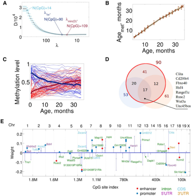 該研究對不同年齡階段的小鼠進行RRBS研究,并找到了90個與年齡相關(guān)的CpG位點來構(gòu)建小鼠生物學(xué)年齡的預(yù)測器。這些位點的clock代表了衰老的生物標志物,并可以用來確定生物體的生物學(xué)年齡,并進一步干預(yù)衰老的速度。
