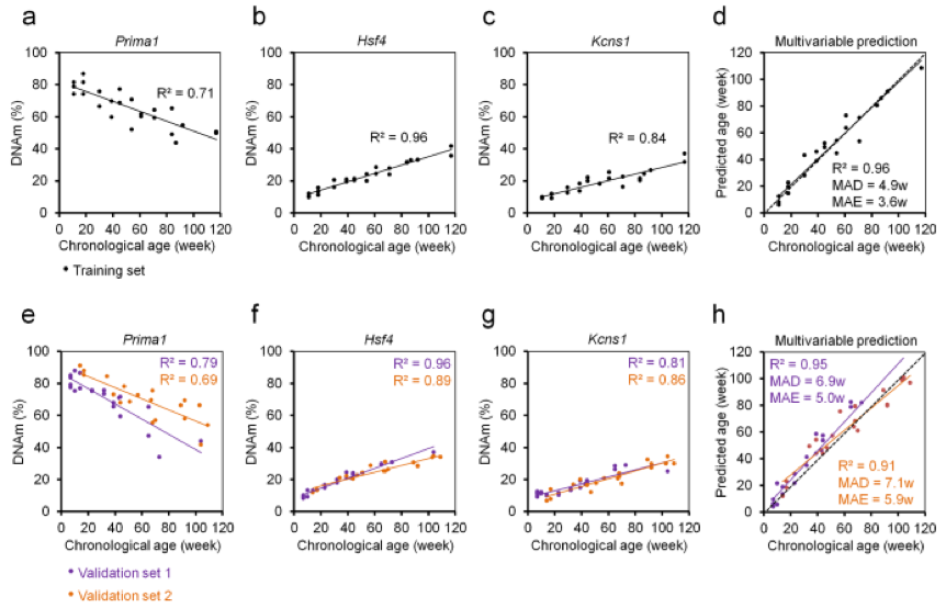 該研究從上述研究及其他研究中的基礎(chǔ)上選擇了9個甲基化區(qū)域在不同年齡段的小鼠血液樣品中進行焦磷酸測序,建立年齡預(yù)測的模型,最后選擇了3個CpG位點(Prima 1, Hsf4, Kcns 1)來預(yù)測小鼠的年齡和壽命。
