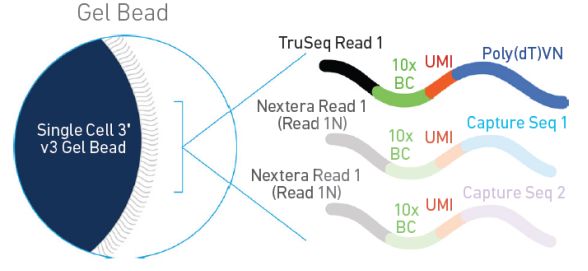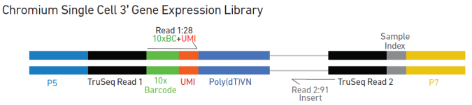 ChromiumTM Single Cell 3′ Solution是基于10 X Genomics平臺,能夠一次性分離、并標(biāo)記500–10000個單細胞,并能在單細胞水平進行檢測的技術(shù),其通過微流控系統(tǒng),將單細胞或長片段DNA分子快速分配到油包水的微反應(yīng)體系中,每個微反應(yīng)體系中的單DNA分子會獲得唯一的特異性分子標(biāo)簽,制備生成的測序文庫可以在illumina平臺進行測序,并由10x Genomics提供數(shù)據(jù)分析及可視化軟件,測序?qū)嶒灱胺治隽鞒炭梢院蚷llumina系統(tǒng)無縫銜接。該平臺廣泛應(yīng)用于3’單細胞轉(zhuǎn)錄組測序、基因組組裝應(yīng)用、免疫組庫測序、ATAC-seq、人全基因組及全外顯子組測序。