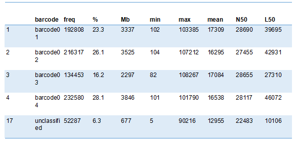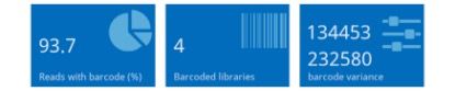 在加入barcode序列混樣測序的情況下,barcode識(shí)別區(qū)分的結(jié)果展示如下,包括barcode識(shí)別效率,區(qū)分的文庫個(gè)數(shù)及每個(gè)文庫中序列個(gè)數(shù)占比和長度信息等。