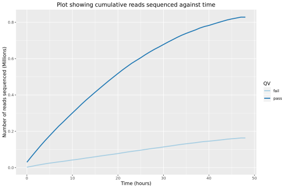 上述分析完成后會(huì)將分析結(jié)果存放至HTML文件,可用瀏覽器打開Nanopore_SumStatQC_Tutorial.html進(jìn)行查看。對單個(gè)芯片約1M reads分析的部分結(jié)果展示如下(結(jié)果來自教程,堿基識(shí)別使用Guppy 2.1.3,根據(jù)識(shí)別序列的平均質(zhì)量值將其分為pass和fail兩種,質(zhì)量值閾值默認(rèn)為7):