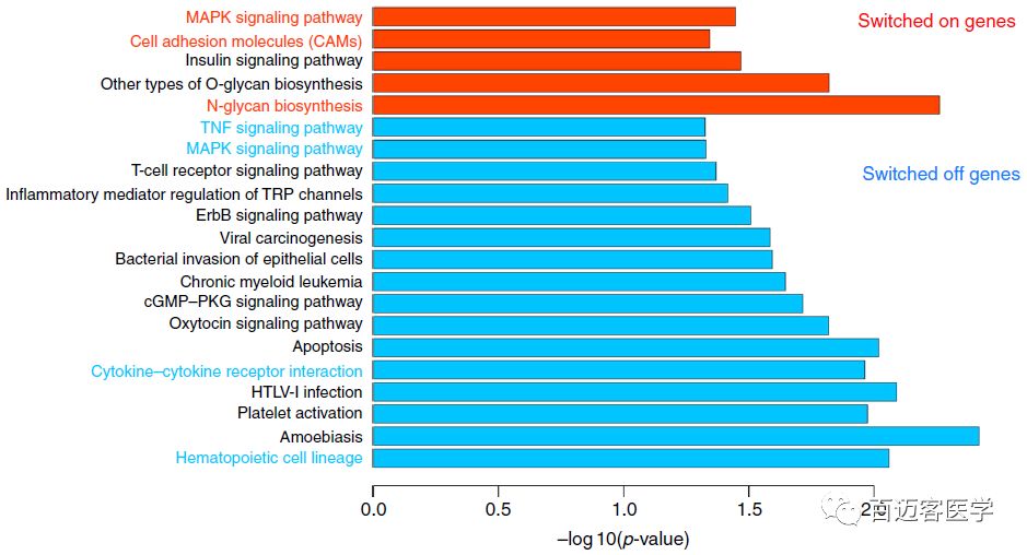 為了探討B(tài)細胞與MM細胞之間三維基因組變化導致的功能性影響,作者對位于MM細胞中6%的compartment B to A的基因組區(qū)域中的基因,以及1%的compartment A to B的基因進行KEGG通路分析。通路富集分析顯示,這些基因與MM相關通路密切相關,包括MAPK信號通路、N-glycan生物合成、TNF信號通路、細胞因子-細胞因子受體相互作用通路。
