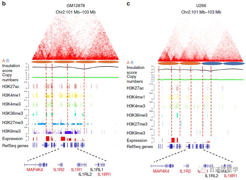 在A/B?compartment轉換區(qū)域內,發(fā)現(xiàn)了一個位于2q11.2-q12.1上的細胞因子受體基因簇,這個區(qū)域在正常B細胞中屬于compartment A,但在MM細胞中均為compartment B,并且與基因表達下調有關,包括多個白介素IL1R1、IL1R2、IL18R1和細胞因子MAP4K4。這個位點的基因表達的變化與TAD結構、表觀遺傳標記相關聯(lián),但與拷貝數(shù)變化不相關。TAD邊界與在癌細胞中發(fā)生變化的IL1R2基因接近,癌細胞中活躍增強子標記H3K27ac 和H3K4me1的信號減弱。結合Hi-C數(shù)據(jù)、WGS數(shù)據(jù)和基因表達數(shù)據(jù),可以在TAD和基因水平上將MM細胞中的空間紊亂和基因表達變化相關聯(lián)。