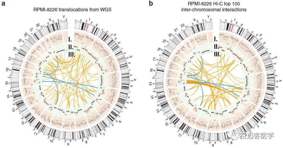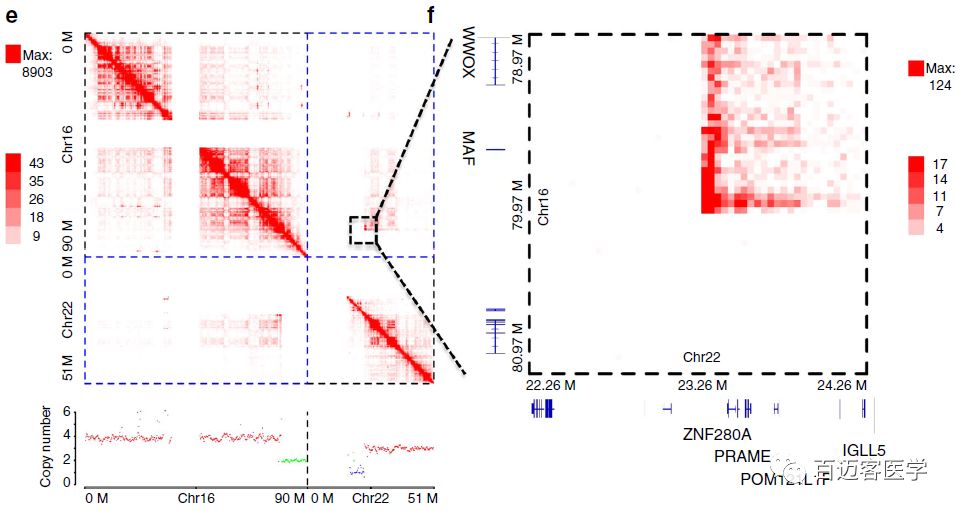在RPMI-8226中,WGS鑒定出56個染色體間易位事件,其中四個也在top?100的Hi-C染色體間互作中,其中包括RPMI-8226的光譜核型(SKY)圖像中檢測到t(16,22)(q23,q11)的易位,涉及MM相關基因WWOX和MAF。在U266細胞中,鑒定到了80個受易位事件影響的基因,包括癌癥相關基因TNIK、FBXW7、TRIM2,其中包含一些之前研究未發(fā)現(xiàn)的MM相關基因。此外距離易位位點1 Mb的基因中,有一半以上是相比于正常B細胞差異表達的。MM細胞系的染色體間整體互作count明顯高于正常B細胞??偟膩碚f,這些結果表明,癌細胞基因組三維構象受到染色體間易位的影響。