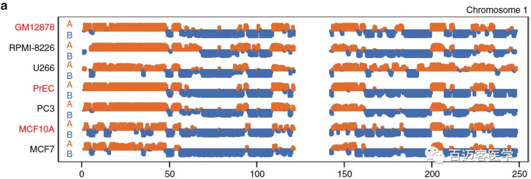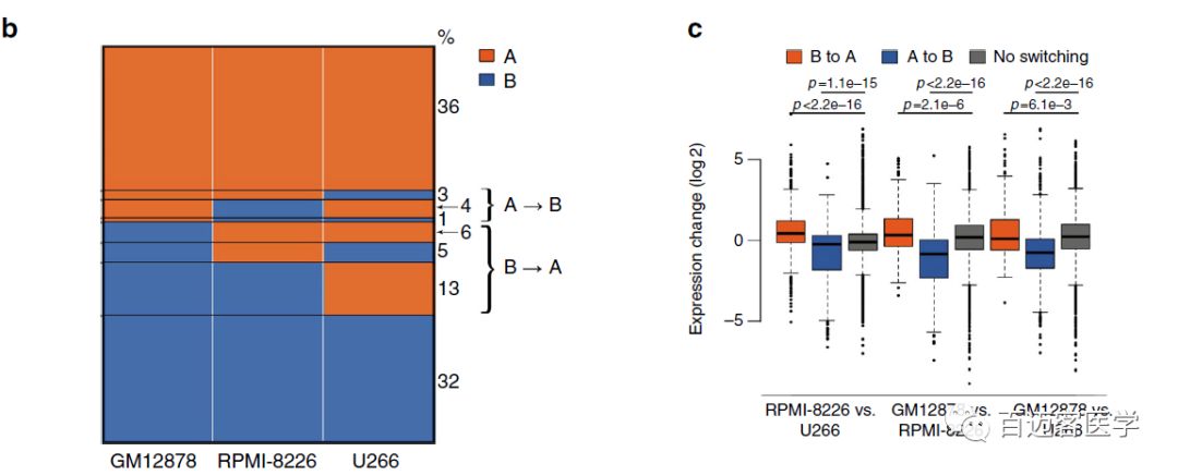 結合Hi-C、RNA-seq數(shù)據(jù),作者對MM細胞與淋巴母細胞樣B細胞系(GM12878)進行了比較,發(fā)現(xiàn)與正常B細胞相比,大多數(shù)基因組區(qū)域在MM細胞中保持相同的compartments。共有8%的基因組區(qū)域從正常B細胞的compartment?A在MM細胞中轉換為compartment?B,并與下調基因表達相關。24%的基因組區(qū)域從compartment?A轉換為compartment?B,并與上調基因表達相關。