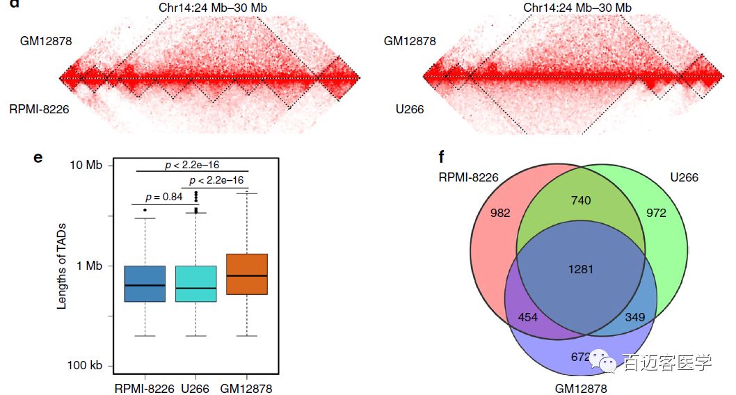 此外,GM12878、RPMI-8226和U266細胞中分別識別出了2756、3457和3342個TAD,TAD大小中值分別為800?kb、600?kb和640 kb。兩種MM細胞TAD數(shù)量較B細胞均增加1.2倍,且MM細胞TAD長度較小。作者在3個樣本中鑒定出1281個保守TAD(TAD重疊超過70%),而僅在2個MM細胞存在的保守TAD有740個。