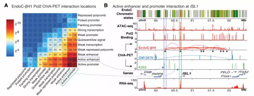 為示意功能性順式調(diào)控網(wǎng)絡(luò),文中在EndoC-bH1中采用RNA聚合酶(Pol2)ChIA-PET,鑒定了25,336個推定的Pol2介導(dǎo)的染色質(zhì)互作。進(jìn)一步過濾,與ATAC-seq OCRs取交集,得到16,756個互作,大多數(shù)與活性增強子和啟動子關(guān)聯(lián)。且與已在人胰島中報道過的互作一致,包括 ISL1和PDX1位點。