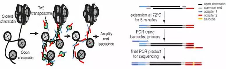 ATAC-seq:Assayfor Transposase-Accessible Chromatin with high throughput sequencing(使用高通量測序對Tn5轉座酶易接近性核染色質區(qū)域進行測序分析),由美國加利福尼亞州斯坦福大學研究人員于2013年提出,是一種表觀遺傳學研究技術,通過轉座酶對某種特定時空下開放的核染色質區(qū)域進行切割,獲得在該時空下基因組中所有活躍轉錄的調控序列。通過ATAC-seq研究可以得到全基因組上處于開放狀態(tài)的染色質區(qū)域,進一步定位核小體及相關調控元件。