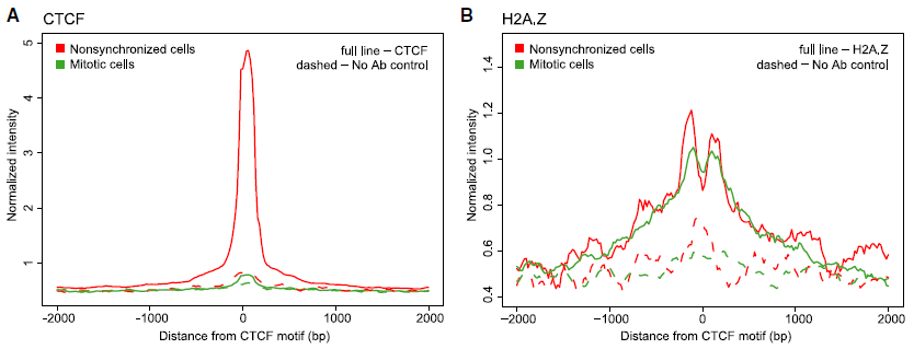 綜上,在前中期期間CTCF與CTCF位點(diǎn)結(jié)合的喪失以及CTCF基序周?chē)娜旧|(zhì)重排,并且cohesin喪失,將導(dǎo)致在有絲分裂期間觀察到的TAD和CTCF環(huán)的喪失,并揭示CTCF位點(diǎn)、關(guān)鍵的結(jié)構(gòu)順式元件以及在蛋白因子結(jié)合和核小體定位中顯示細(xì)胞周期階段依賴性動(dòng)力學(xué)。