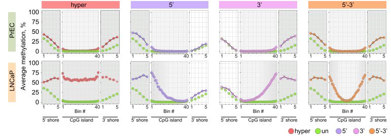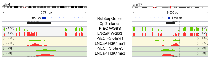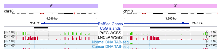采用chip-seq數(shù)據(jù),分析H3K4me1在癌癥CpG島超甲基化中的富集方式。H3K4me1高富集于hESCs CpG島的body區(qū),在癌癥中呈現(xiàn)廣泛超甲基化。相反,癌癥中未甲基化的CpG島,在hESCs中表現(xiàn)為邊界雙峰富集及島區(qū)域降低。并且,文章發(fā)現(xiàn)一種hESCs中不對(duì)稱的H3K4me1富集模式,在對(duì)應(yīng)5’或3’內(nèi)CpG島邊界,易于癌癥中DNA甲基化。通過可視化圖展現(xiàn)了候選的CpG島,顯示癌癥中5’和3’的甲基化堆積,可以由正常前列腺細(xì)胞中H3K4me1預(yù)先標(biāo)記。