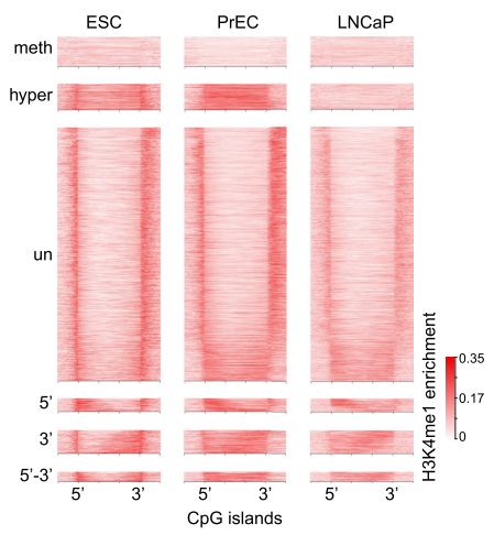 - CpG島邊界的H3K4me1模式與其甲基化模式關(guān)聯(lián);