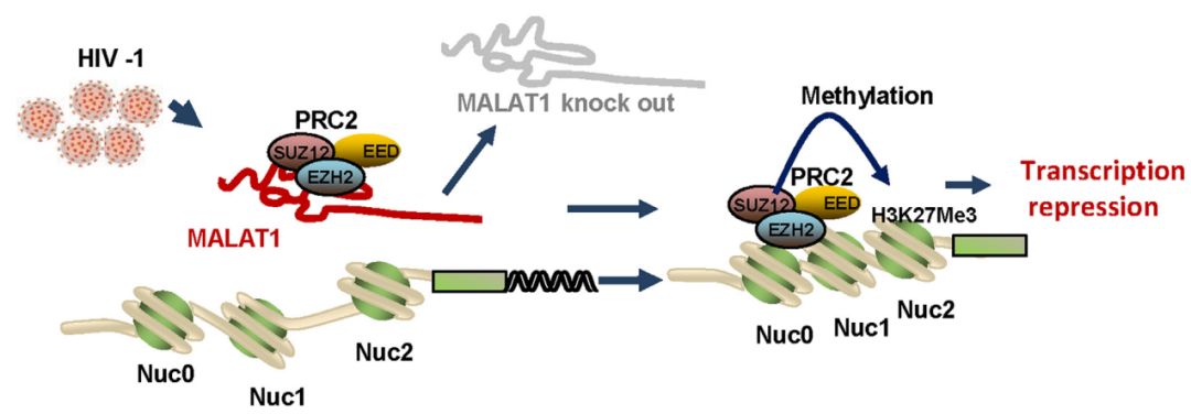 作者在這里發(fā)現(xiàn)MALAT1通過與PRC2的結(jié)合,將EZH2從與HIV-1 LTR啟動子的結(jié)合中分離出來,從而清除了PRC2 復(fù)合物介導(dǎo)的組蛋白H3第27位賴氨酸上的三甲基化(H3K27me3),進而緩解了HIV-1轉(zhuǎn)錄的表觀遺傳沉默。此外,用潛伏期逆轉(zhuǎn)劑(LRA)刺激HIV-1的再激活可誘導(dǎo)潛伏感染細胞中MALAT1的表達。成功的聯(lián)合抗逆轉(zhuǎn)錄病毒療法(cART)的患者伴有MALAT1表達顯著減少,說明MALAT1表達與HIV-1復(fù)制呈正相關(guān)。因此作者的研究確認了MALAT1對HIV-1轉(zhuǎn)錄的促進作用,且MALAT1可能是新療法的潛在靶點。