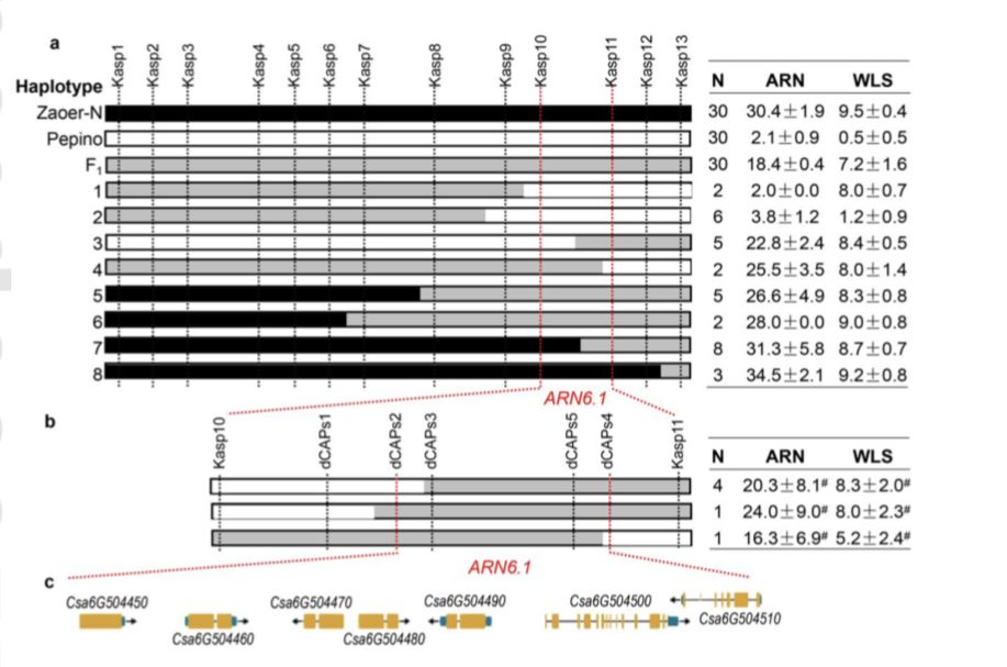本研究利用SLAF-BSA技術(shù),將黃瓜耐澇基因定位在301kb區(qū)間內(nèi)(初定位群體為949株,選擇50+50的混池),針對(duì)定位區(qū)間的SLAF標(biāo)簽的SNP信息設(shè)計(jì)KASP標(biāo)記和dCAPS標(biāo)記,并對(duì)6691個(gè)F2子代和6個(gè)F2:3家系進(jìn)行分型,結(jié)合重組個(gè)體基因分型和表型數(shù)據(jù),將ARN6.1定位在36.1kb的范圍內(nèi),后期結(jié)合轉(zhuǎn)錄組,找出候選基因CsARN6.1。