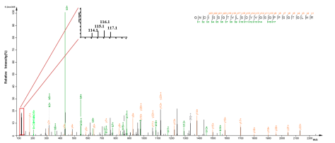 在質(zhì)譜圖中,任何一種iTRAQ試劑標(biāo)記的不同樣本中的同一蛋白質(zhì)表現(xiàn)為相同的質(zhì)荷比。在串聯(lián)質(zhì)譜中,報告基團(tuán)、質(zhì)量平衡基團(tuán)和多肽反應(yīng)基團(tuán)之間的鍵斷裂,質(zhì)量平衡基團(tuán)丟失,帶不同同位素標(biāo)簽的同一多肽產(chǎn)生質(zhì)量為114,115,116和117Da(八標(biāo)為113、114、115、116、117、118、119和121 Da)的報告離子(Fig.3中紅色標(biāo)記),根據(jù)報告離子的豐度可獲得樣品間相同肽段的定量信息,再經(jīng)過軟件處理得到蛋白質(zhì)的定量信息。