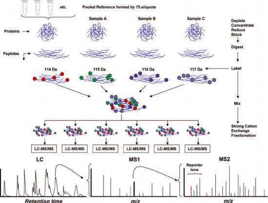 (1)不同樣本標(biāo)記之后混樣,統(tǒng)一處理上機(jī),減少了分別上機(jī)造成的實(shí)驗誤差,并利用同位素標(biāo)簽的豐度來檢測,定量更z確,重復(fù)性更好;