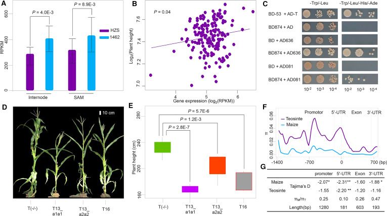 為進一步確定候選基因,本研究又通過RNA-seq分析發(fā)現(xiàn),Zm00001d020874表達量在雙親的莖頂端分生組織(SAM)與幼嫩節(jié)間組織中存在顯著性差異?;跀M南芥同源蛋白功能與smoothLOD定位信號,認為Zm00001d020874qPH7的候選基因,并且后續(xù)的CRISPR基因敲除,蛋白互作驗證等實驗均暗示Zm00001d020874是控制株高的基因。