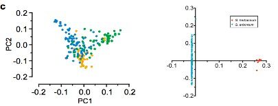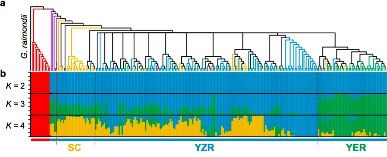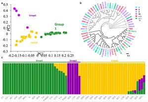 共計(jì)選擇了243份二倍體棉花材料:230份亞洲棉G. arboreum?(A2)?和13份草棉G. herbaceum?(A1),來自于中國南部(SC),長江(YZR)和黃河(YER)。以雷蒙德氏棉(G. raimondii)為外群,構(gòu)建系統(tǒng)發(fā)育樹顯示,G. herbaceum(草棉)和G. arboretum(亞洲棉)聚類成2個(gè)獨(dú)立的群(見圖2a和b)。G. arboretum(亞洲棉)進(jìn)一步又分為SC,YZR和YER三個(gè)群,顯示了地理分布模式的差異,進(jìn)而利用PCA分析支持這一結(jié)果(見圖2c)。