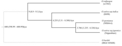 利用OrthoMCL軟件檢測WR04-6、R498、Nipponbare和W1943(O. rufipogon)間核心的、非必須的和共有的基因家族。在WR04-6中鑒定到了909個(gè)擴(kuò)張的基因家族,并且通過通路分析顯示,這些基因在光合作用和呼吸作用中顯著富集(p<0.01),例如氧化磷酸化、光合作用和核糖體的KEGG途徑,考慮其可以作為遺傳改良的信號(hào)。以O. barthii作為外群構(gòu)建的進(jìn)化樹顯示W(wǎng)R04-6與粳稻祖先的分化時(shí)間估計(jì)在3,706ya(1,235ya-6,326ya),見圖4。