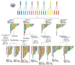 在構(gòu)樹基因組中共發(fā)現(xiàn)15,254個(gè)基因家族,與桑樹分化之后,有431個(gè)基因家族擴(kuò)張,230個(gè)基因家族收縮,表明在適應(yīng)進(jìn)化過程中,構(gòu)樹中更多的基因家族經(jīng)歷了擴(kuò)張而不是收縮。另外,與苜蓿、毛楊和甜橙相比,轉(zhuǎn)錄因子發(fā)生明顯收縮(58個(gè)家族共1,342個(gè)轉(zhuǎn)錄因子,占蛋白編碼基因的4.4%)。肌動(dòng)蛋白在植物的生長和發(fā)育的很多層面扮演著重要的角色,在酵母和很多動(dòng)物中,肌動(dòng)蛋白僅被一個(gè)單基因編碼。在構(gòu)樹中僅發(fā)現(xiàn)4個(gè)肌動(dòng)蛋白,少于藻類、小立碗蘚和無油樟。