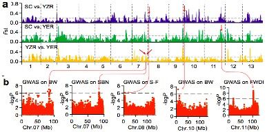 人工選擇在農(nóng)作物的馴化和遷徙的過程中具有重要的作用。群體結(jié)構(gòu)分析顯示當(dāng)K=4時(shí),YER與SC和YZR明顯不同(圖2b,K=4)。通過兩兩群體間的選擇性清除分析(FST)鑒定出了分別覆蓋到59,53和51個(gè)顯著遺傳分化的區(qū)域。SC和YZR之間的21個(gè)分化的區(qū)域(約43.5 Mb?含有915個(gè)基因)在群體SC和YER之間是保守的(圖3a)。對(duì)來自不同環(huán)境下的11個(gè)重要性狀進(jìn)行全基因組關(guān)聯(lián)分析,在98個(gè)顯著關(guān)聯(lián)的信號(hào)中,其中25信號(hào)個(gè)來自基因區(qū)(外顯子或內(nèi)含子區(qū)),包含與形態(tài)性狀相關(guān)的8個(gè)信號(hào)區(qū),與產(chǎn)量性狀相關(guān)的6個(gè)信號(hào)區(qū),與油籽性狀相關(guān)的3個(gè)信號(hào)區(qū);剩余73個(gè)信號(hào)來自非編碼區(qū)。大部分農(nóng)藝性狀的GWAS關(guān)聯(lián)信號(hào)中顯示地理差異,如分支數(shù),開花期,鈴重和抗病性這些性狀定位在保守的基因區(qū)(圖4b)。