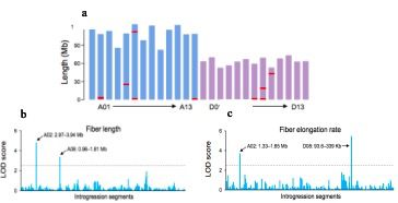 由陸地棉Emian22作為受體親本,海島棉3-79作為供體親本構(gòu)建包含168個(gè)個(gè)體的CSSLs群體,旨在引入有利的變異,如纖維質(zhì)量。QTL定位分析,共鑒定到5個(gè)性狀的13個(gè)QTLs位點(diǎn),其中控制纖維長度位點(diǎn)2個(gè),控制纖維強(qiáng)度位點(diǎn)4個(gè),馬克隆值位點(diǎn)2個(gè),纖維伸長率位點(diǎn)2個(gè),纖維均勻度位點(diǎn)3個(gè)(圖3)。在這些QTLs位點(diǎn)中,9個(gè)位點(diǎn)之前未被鑒定出,通過檢驗(yàn)13個(gè)QTLs中的基因表達(dá)水平,研究人員檢測到了235個(gè)在纖維發(fā)育過程中高度表達(dá)的基因,同時(shí)還整合了基因組變異數(shù)據(jù)來預(yù)測候選基因,而這些基因值得進(jìn)一步進(jìn)行精細(xì)定位以確認(rèn)對(duì)這些性狀具有重要影響的基因。