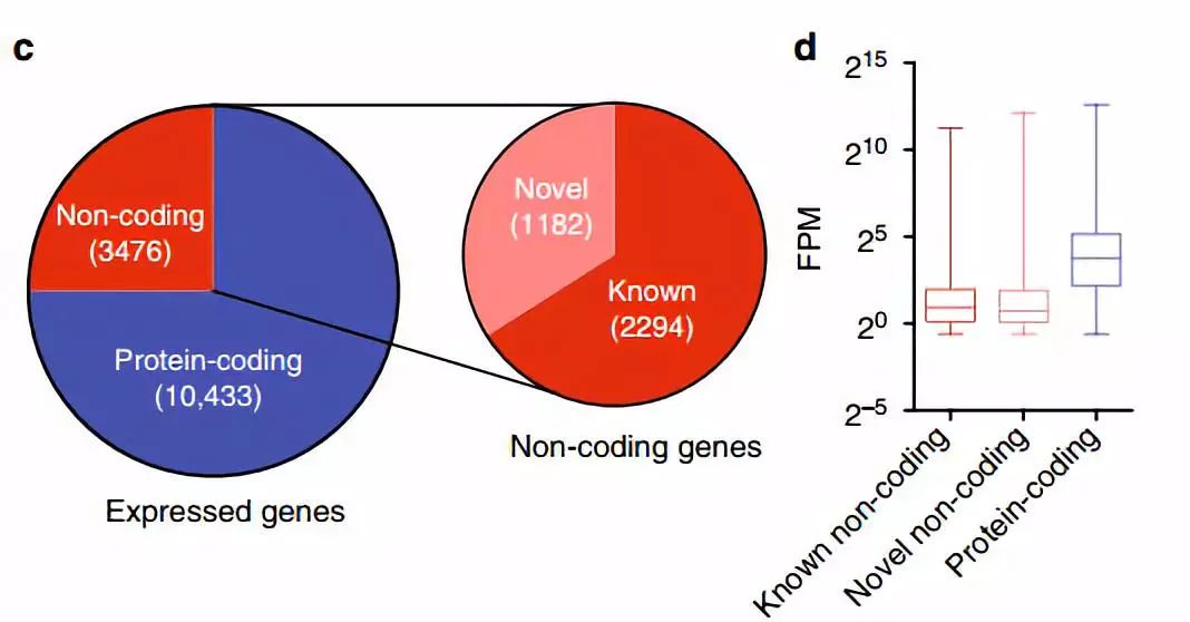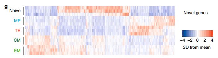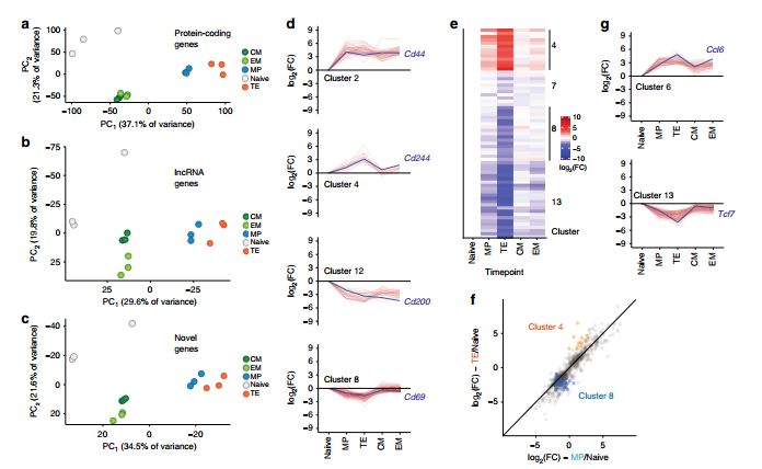 從LCMV感染小鼠中分離病毒特異性的CD8+T細胞亞群,對不同類型的細胞進行RNA-seq。包括初始T細胞、終末分化效應(yīng)T細胞(short-livedterminal effector ,TE)、記憶前體T細胞(memory precursor ,MP)、中心記憶T細胞(central memory ,CM) 、效應(yīng)記憶T細胞(effector memory ,EM)?;跀?shù)據(jù)組裝分析,共鑒定到13909個unique genes,75%是蛋白編碼基因,25%是非編碼。在非編碼基因中,三分之一在數(shù)據(jù)庫中未收錄,因為認為是新基因。這些新基因比已注釋非編碼基因有較高的表達水平,但這兩類基因均比編碼基因低表達。采用CPAT進行編碼潛能分析,大部分新轉(zhuǎn)錄本包括單個外顯子,不到25%的新轉(zhuǎn)錄本包括2個及以上外顯子。雖然不具有蛋白編碼潛能,但大部分新基因在CD8+T細胞分化過程中表現(xiàn)出特異性,包括記憶細胞中的特異性表達。