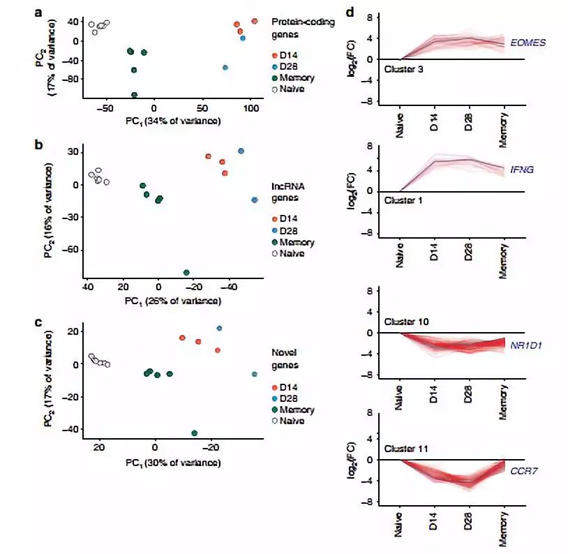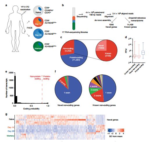 基于之前健康志愿者的測序數(shù)據(jù)(采用YFV-17D黃熱疫苗,分選CD8+T細胞,收集初始T細胞,14天CD8+T細胞、28天CD8+T細胞、記憶細胞),進行轉(zhuǎn)錄組分析。鑒定出已注釋的3165個非編碼轉(zhuǎn)錄本,1098個未注釋的。與小鼠數(shù)據(jù)相比,人數(shù)據(jù)中也表現(xiàn)出編碼基因表達高于非編碼基因。同樣許多鑒定的新轉(zhuǎn)錄本是單外顯子,編碼潛能低于鼠鑒定的轉(zhuǎn)錄本。與小鼠數(shù)據(jù)類似,許多新轉(zhuǎn)錄本在T細胞分化中表現(xiàn)出特異性。