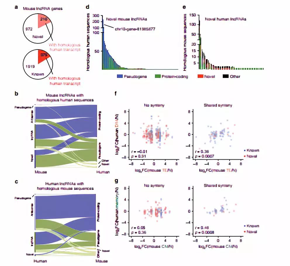 更重要的是,小鼠和人在效應(yīng)及記憶T細胞分化中已觀察到一些相似的基因程序。這些研究集中于編碼轉(zhuǎn)錄本的水平,但目前關(guān)于非編碼轉(zhuǎn)錄本在這一過程中的表達變化鮮有報道。作者基于之前工作采用RNA-seq展開研究,以鑒定響應(yīng)病毒感染的人和小鼠CD8 +?T細胞中長非編碼RNA(lncRNA)表達的變化。通過lncRNA測序研究,鑒定出上百條未注釋的lncRNA,基于表達分析可以將lncRNA對初始、效應(yīng)和記憶CD8+T細胞亞群分類,意味著在抗原啟動分化過程中它們可能參與決定不同分化命運。通過小鼠與人類lncRNA表達數(shù)據(jù)的比較,發(fā)現(xiàn)具有保守性的lncRNA。
