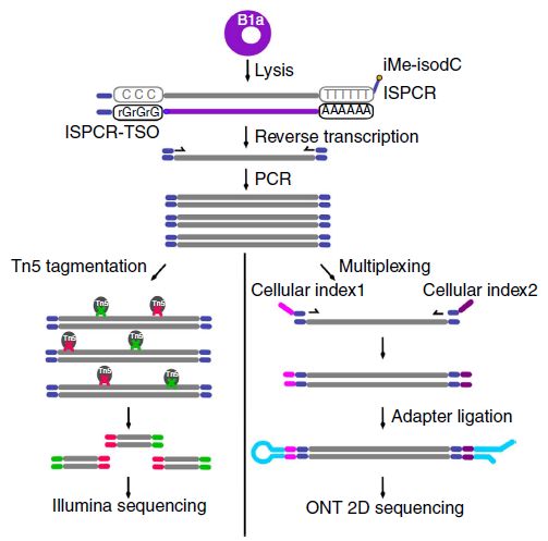 單個(gè)基因不同轉(zhuǎn)錄本isoform產(chǎn)生的蛋白質(zhì)具有不同的生物特性,包括穩(wěn)定性、細(xì)胞內(nèi)定位、酶活性和翻譯后修飾。Isoform是可選擇性轉(zhuǎn)錄起始位點(diǎn)(transcription start sites,TSS)、轉(zhuǎn)錄終點(diǎn)(transcription end sites,TES)和可變剪接事件等的產(chǎn)物。據(jù)預(yù)測(cè),大部分人類基因存在可變剪接。可變剪接突變與人類遺傳病和腫瘤均密切相關(guān)。故而,不僅需要在基因水平鑒定轉(zhuǎn)錄組多樣性,也需要在轉(zhuǎn)錄本表達(dá)水平分析細(xì)胞真正的轉(zhuǎn)錄多樣性。二代轉(zhuǎn)錄組測(cè)序弊端:目前基于二代平臺(tái)的短讀長(zhǎng)RNAseq方法在識(shí)別復(fù)雜轉(zhuǎn)錄本isoform方面存在固有限制,因?yàn)樗鼈儾荒軠y(cè)序全長(zhǎng)轉(zhuǎn)錄本。相反,轉(zhuǎn)錄本被片段化以進(jìn)行測(cè)序,其產(chǎn)生的單個(gè)短reads無法跨越整個(gè)轉(zhuǎn)錄本。算法工具可用于從這些reads中組裝完整的轉(zhuǎn)錄本,但不同的組裝算法可能會(huì)導(dǎo)致相互矛盾的結(jié)果,整體組裝質(zhì)量良莠不齊。為了克服二代短讀長(zhǎng)RNAseq的這種限制,出現(xiàn)了基于三代測(cè)序平臺(tái)的全長(zhǎng)轉(zhuǎn)錄本測(cè)序,比如ONT平臺(tái)全長(zhǎng)轉(zhuǎn)錄組測(cè)序技術(shù)。研究表明,在看似同質(zhì)的細(xì)胞群體中各個(gè)細(xì)胞在基因表達(dá)方面可能不同。細(xì)胞間異質(zhì)性使免疫細(xì)胞成為深入分析轉(zhuǎn)錄多樣性的靶標(biāo)。研究目的:通過使用ONT技術(shù)對(duì)全長(zhǎng)cDNA分子進(jìn)行測(cè)序,探究小鼠B1a細(xì)胞的單細(xì)胞轉(zhuǎn)錄組多樣性。